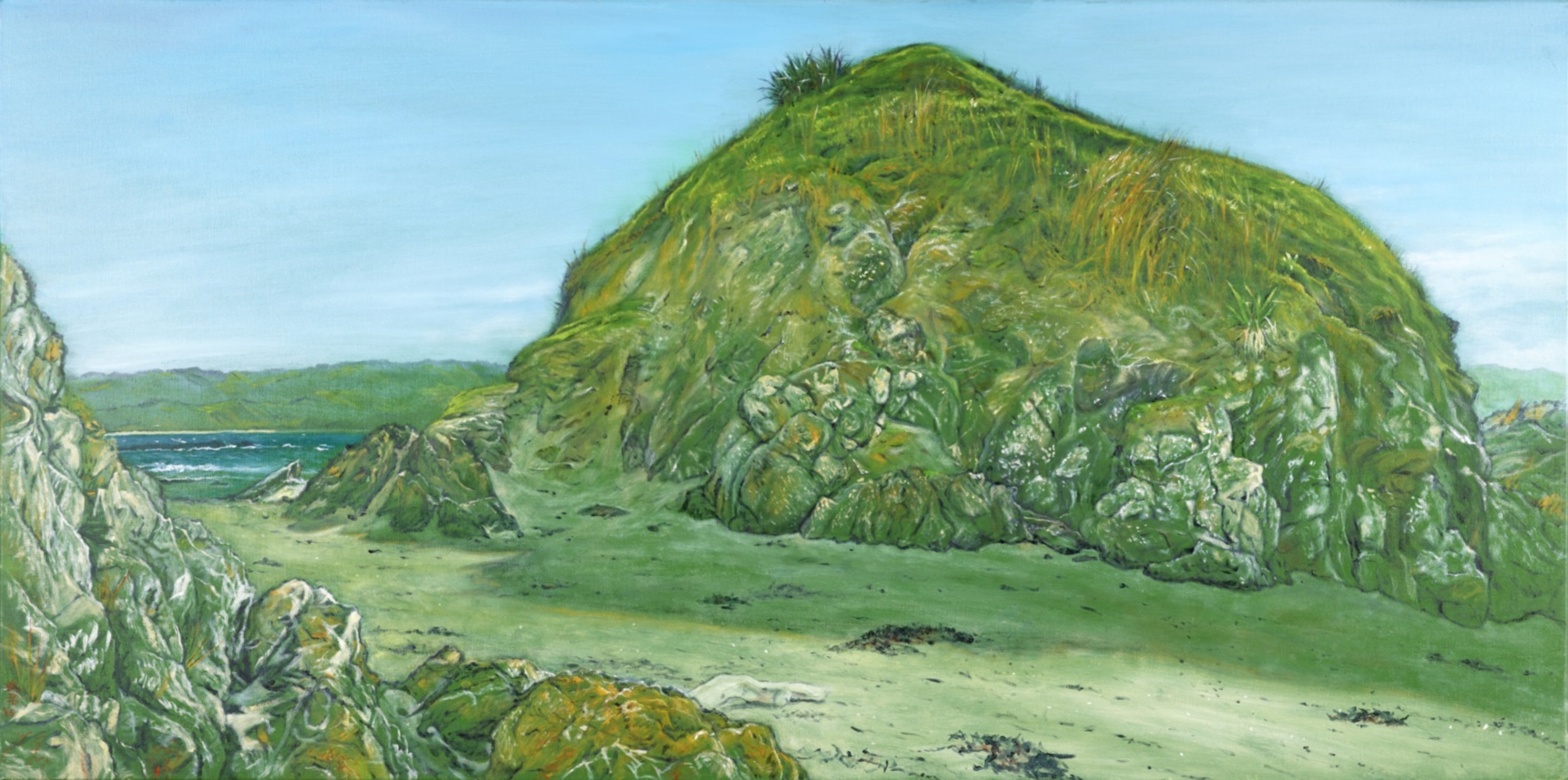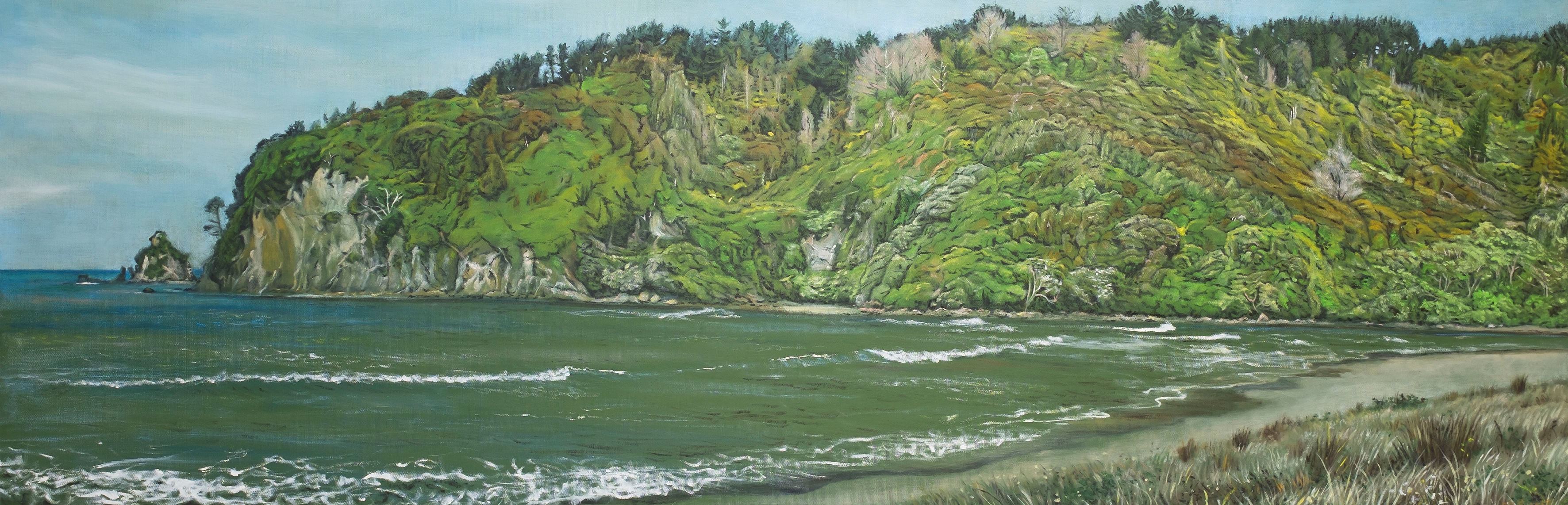 She painted two at Whangamata over January and early February. Over March to June she painted the two at Tawharanui. In October, she finished the one of Flaxmill Bay (which she had started a couple of years earlier - which posed a challenge, because the kanuka in the foreground had grown considerably).